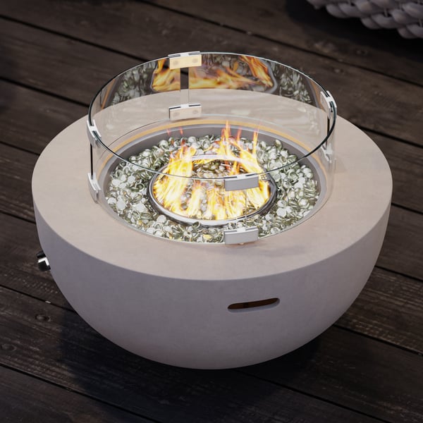 Stół z paleniskiem gazowym na propan, wyposażony w przednią szybę ze szkła, idealny na patio, taras lub do ogrodu.
